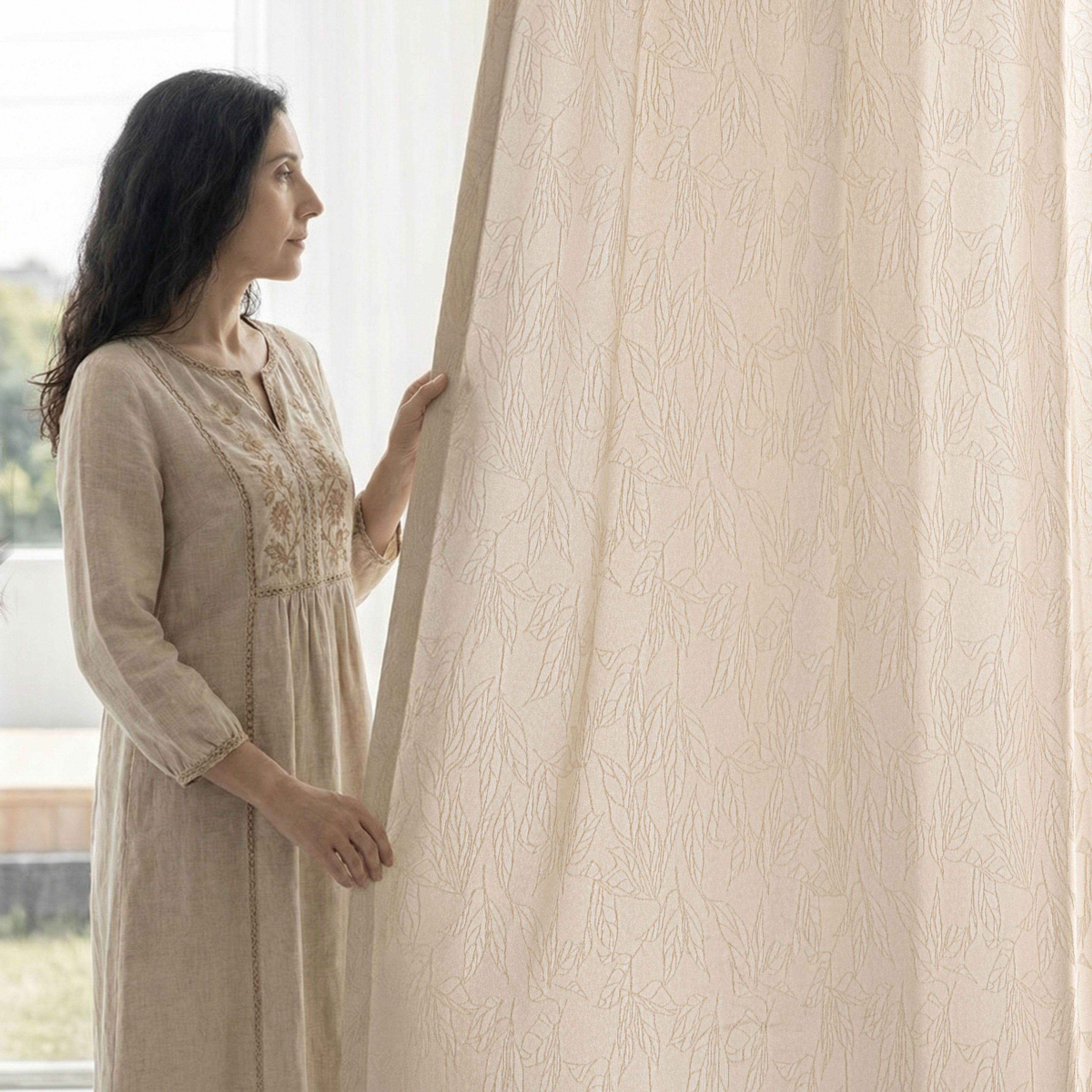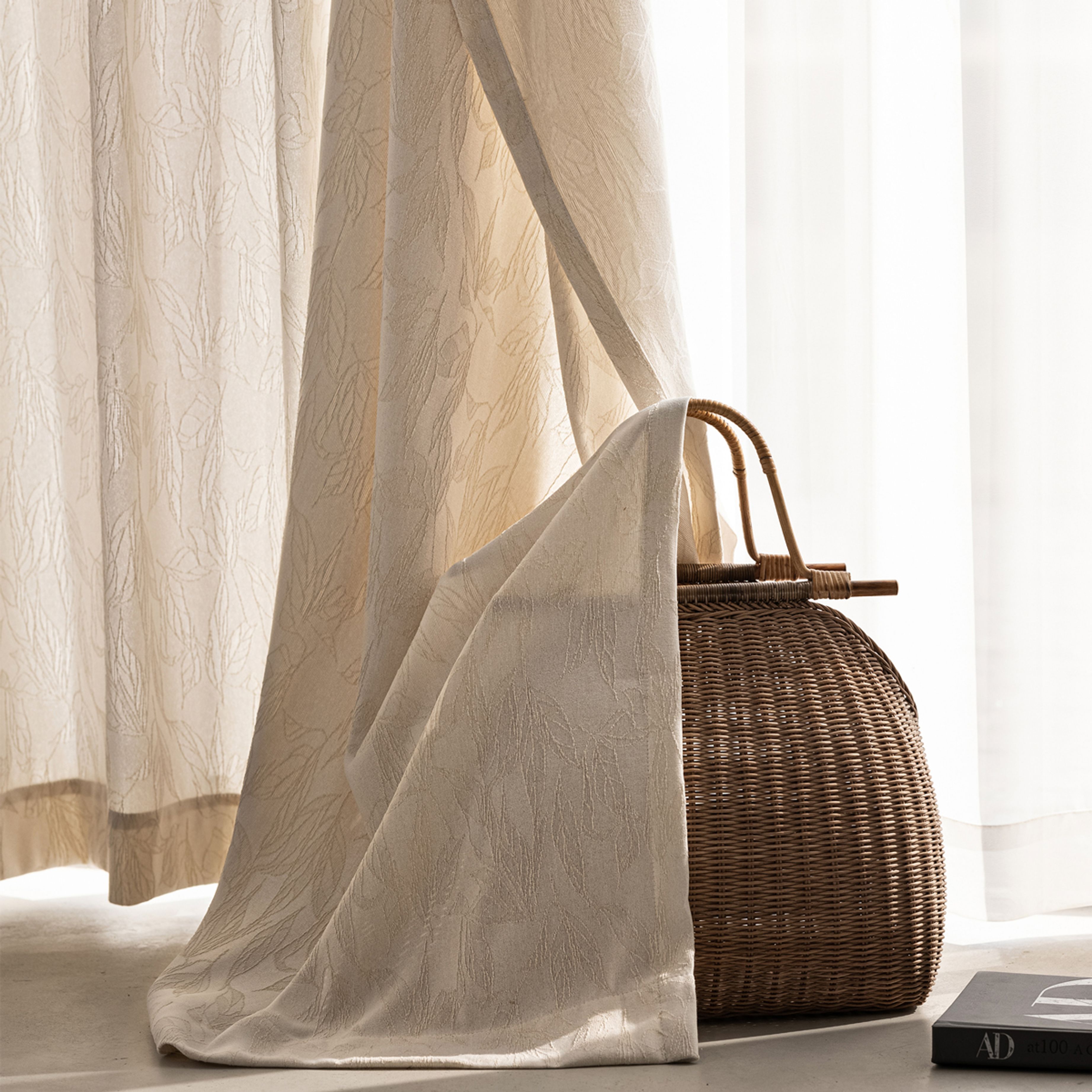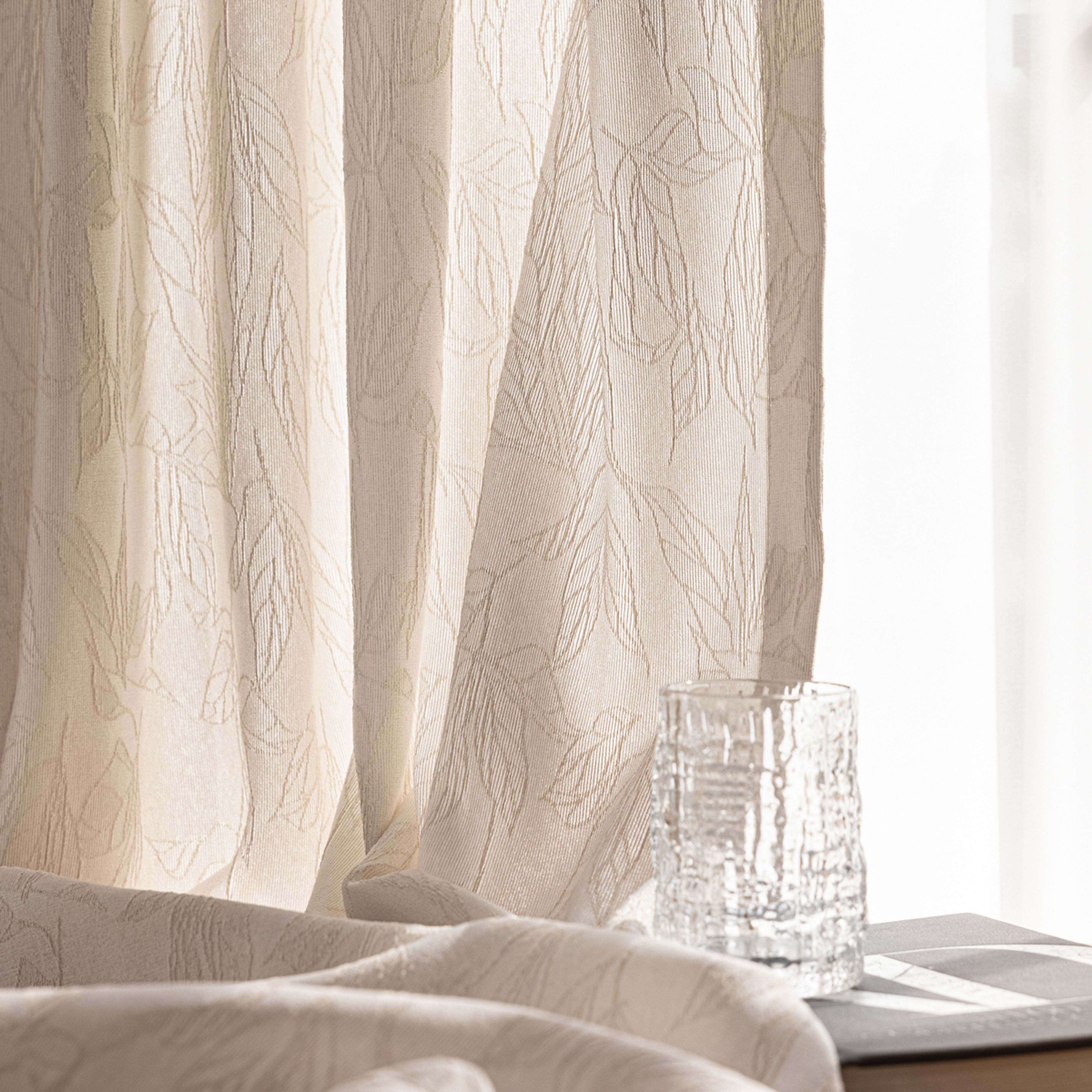 Delicate leaf motifs woven into the fabric bring nature's subtle artistry to your windows.