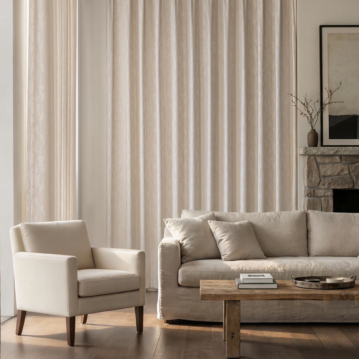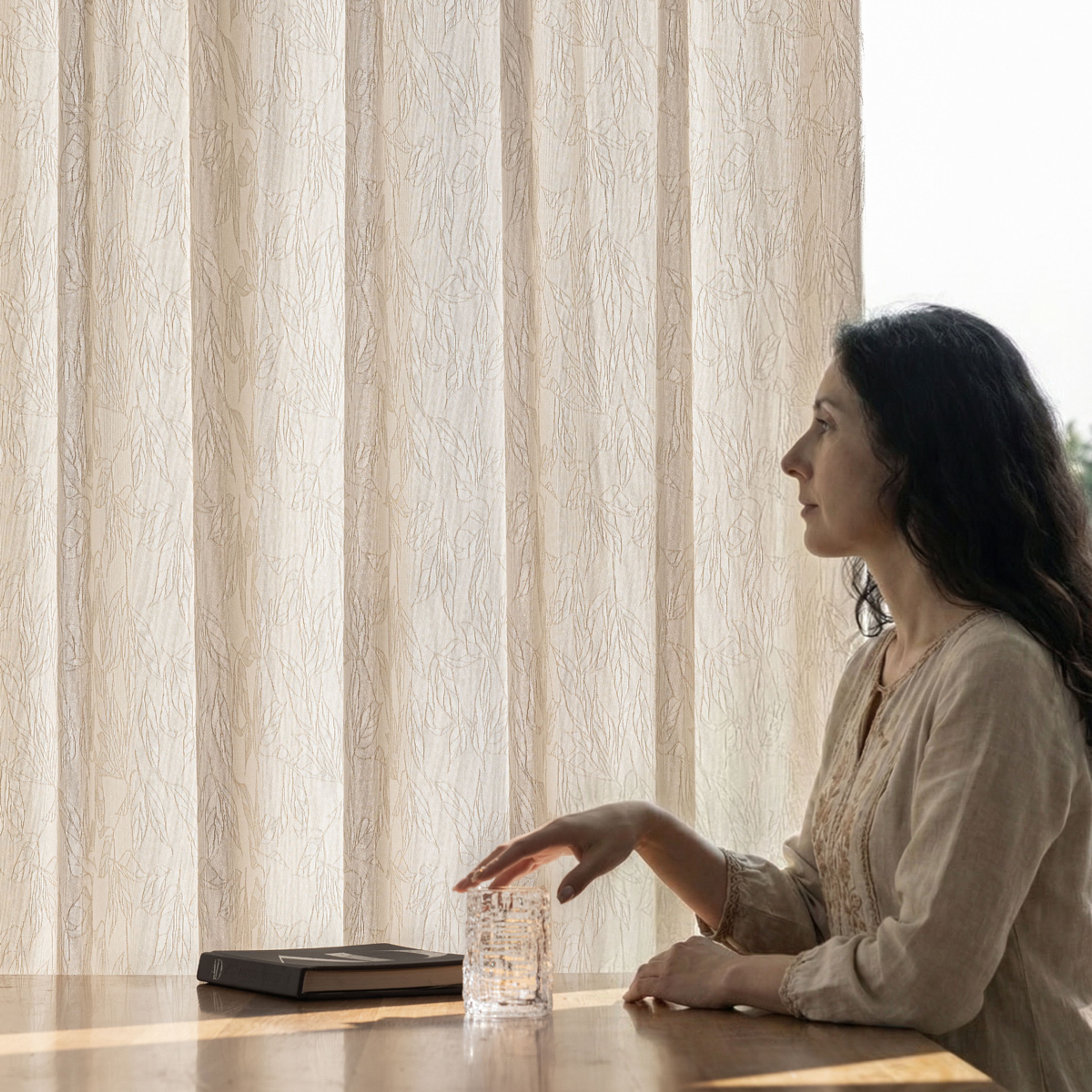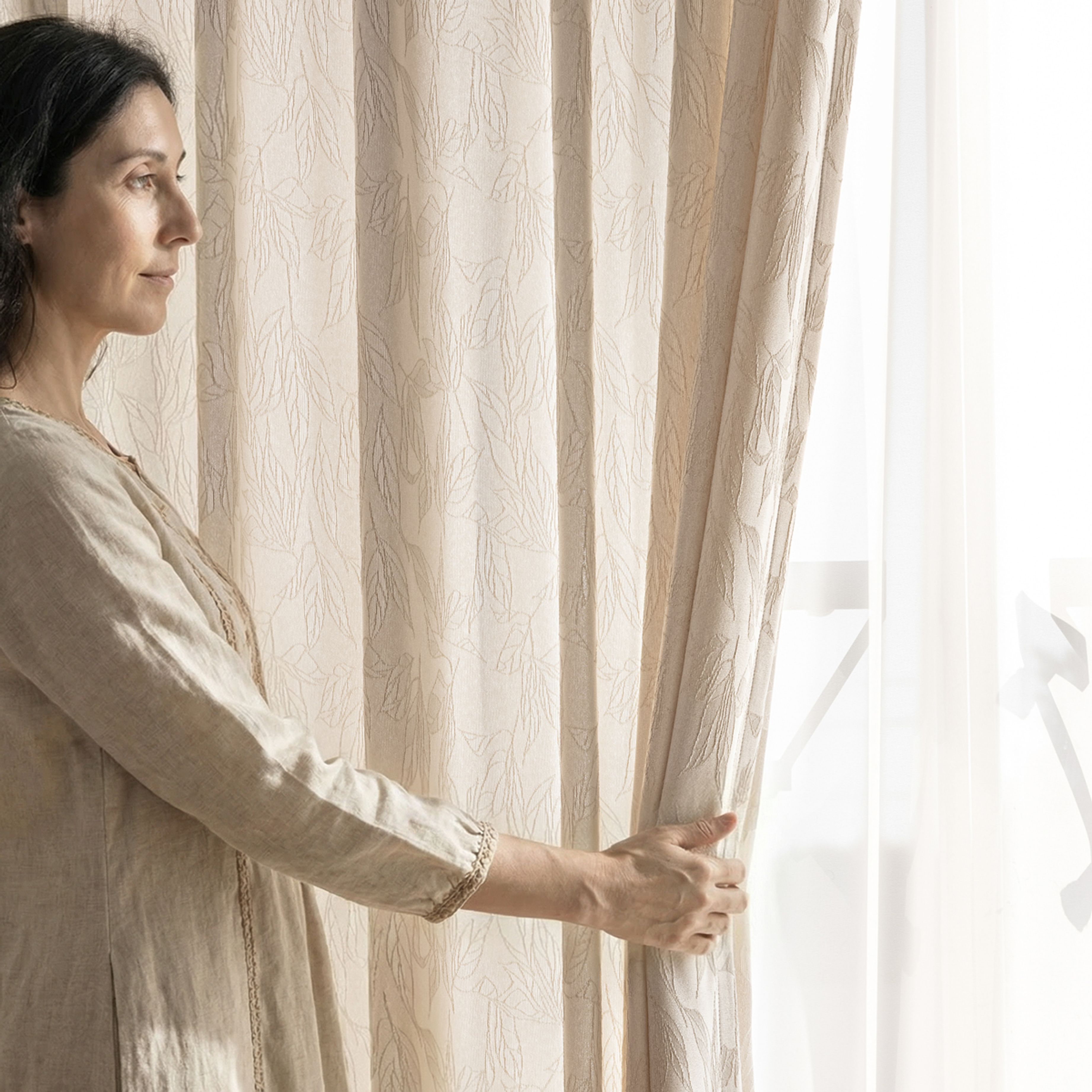 Delicate leaf motifs woven into the fabric bring nature's subtle artistry to your windows.